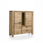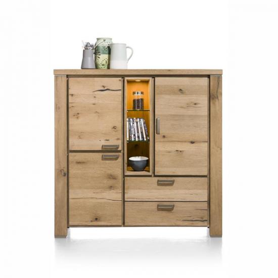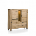 Augstums – 150cmIzturiīga kumode ar vintage izskatu. Šai kumodei no Henders & Hazel Avalon kolekcijas ir pārsteidzošs izskats. Kumode ir izgatavota no Primo Laminato izturīga materiāla, kas praktiski neatšķiras no īsta koka un izskatās kā vecināts koks. Melni metāla akcenti piešķir šai kumodei īpašu izskatu. Kumode ir 2 durvis, 1 sekretertipa atvāžamas durvis un 1 stikla durvis aiz kurām ir integrēta silta LED gaisma.