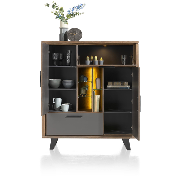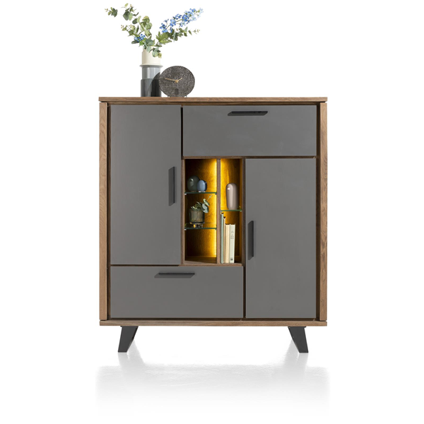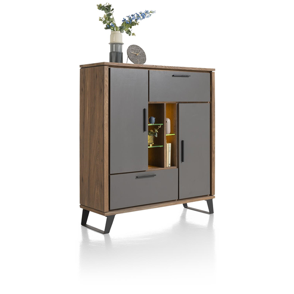 Cubo kolekciju raksturo moderns dizains un silts izskats. Kumodei ir 2 durvis, 1 atvāžamas durvis, 1 atvilktne un 5 atvērti nodalījumi ar LED apgaismojumu. Kumode ir izgatavota izmantojot ozola finierējumu un lakota dedzinātā ozola krāsā, atvilktnes un durvju fasādes ir izgatavotas no Primo Laminato vēsā antracīta krāsā.