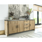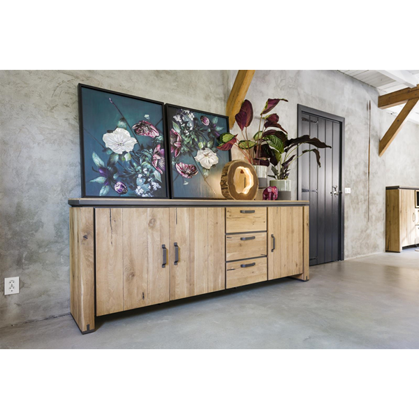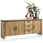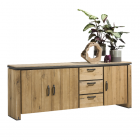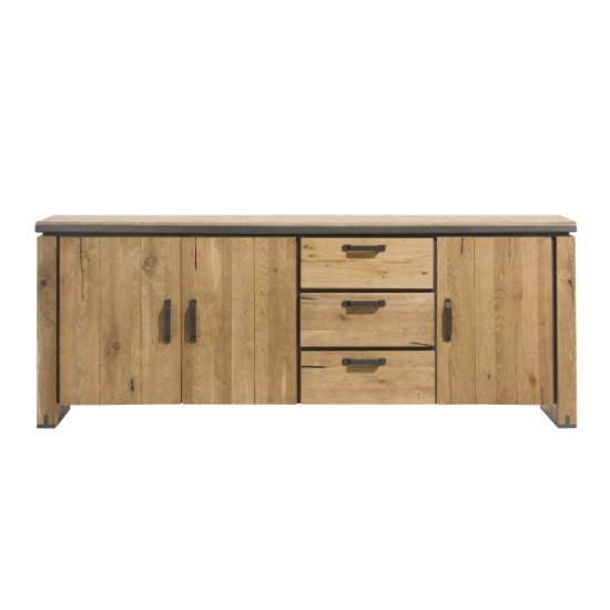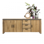Kumode Farmland ar elegantu, rustikālu dizainu. Izgatavota no ozola un ozola finiera, tā ir Railway Brown krāsā. Metāla detaļas piešķir tai izteiksmīgu, stilīgu pieskārienu. Kumodei ir trīs durvis un trīs atvilktnes, kas piedāvā plašu uzglabāšanas vietu.