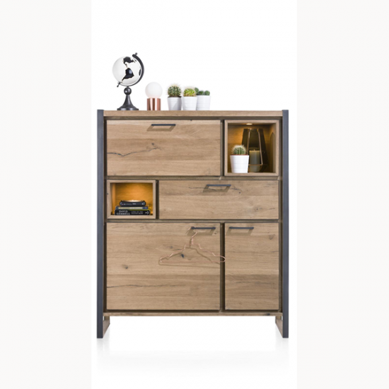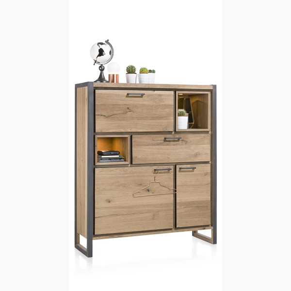 Metalo kolekcijas augstā kumode ir moderna un izturīga. Ozolkoka finiera un metāla kombinācija rada izteiksmīgu dizainu. Metāla profili ap atvilktnēm, durvīm un nišām piešķir tiem pēdējo akcentu. Integrētais LED apgaismojums nišās rada patīkamu atmosfēru. Metāla kājas, kas stiepjas gar kumodes sāniem, ir stilīgs akcents. Lieliska kumode tiem, kam patīk izteiksmīgs un mūsdienīgs interjers.