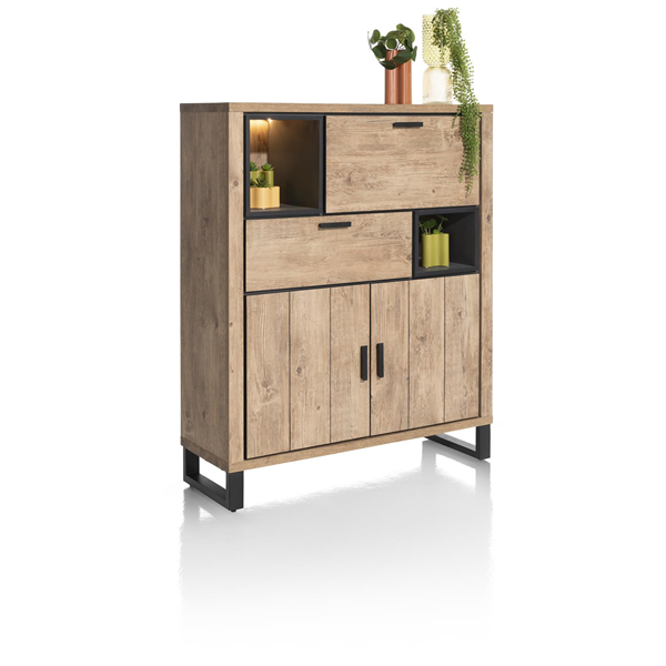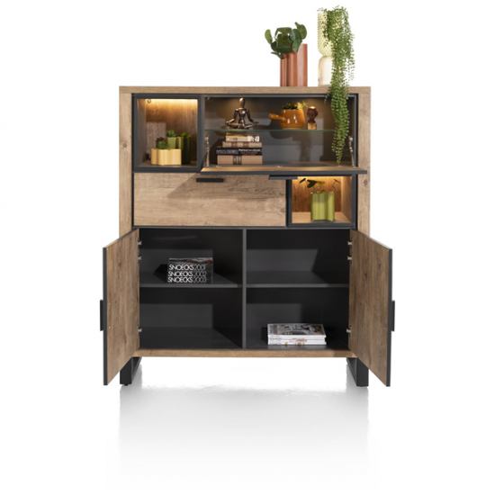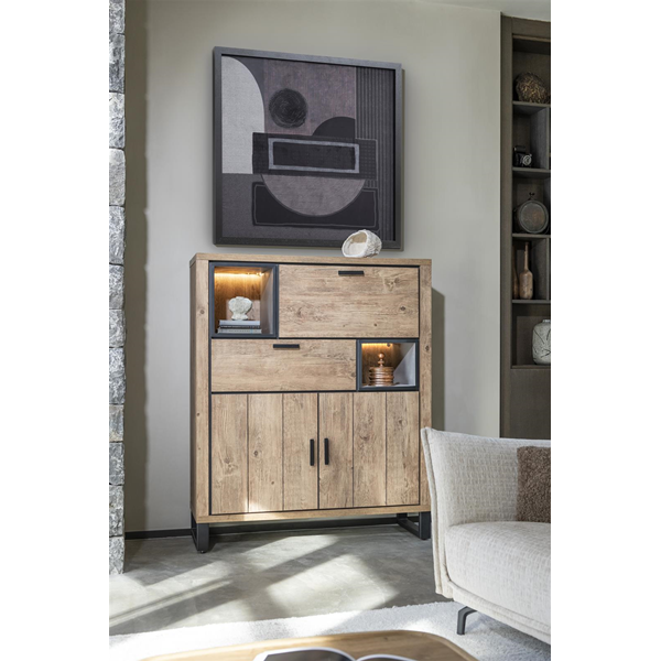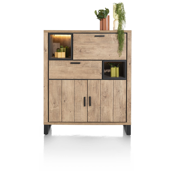 Liela kumode ar robustu izskatu no Henders & Hazel Pavarotti kolekcijas. kumode ir izgatavota no Primo Laminato izturīga materiāla, kas praktiski neatšķiras no īsta koka un izskatās kā vecināts koks. Melni metāla akcenti piešķir šai kumodei īpašu izskatu. Kumodei ir 1 atvikne, 2 durvis, 1 atvāžamas sekretertipa durvis un 1 atvērta niša, ko var izgaismot silta LED gaisma.