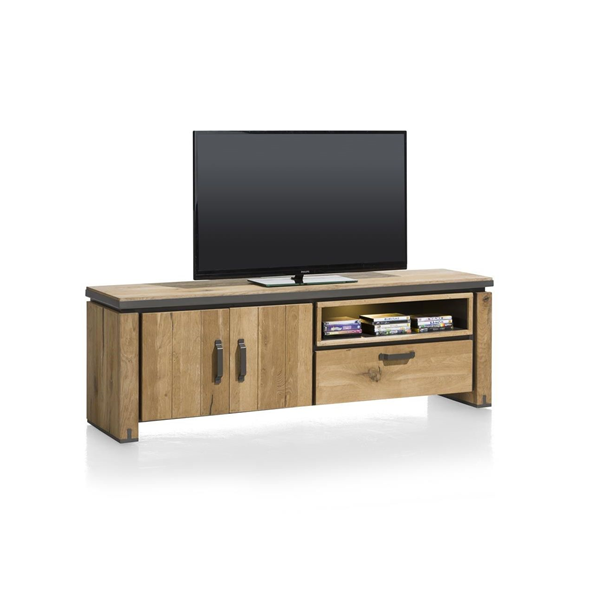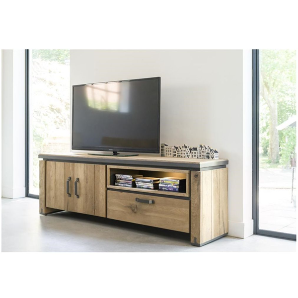 Meklējat stilīgu TV kumodi ar mūsdienīgu izskatu? Farmland kolekcijā ir 180cm gara tv kumode ar divām durvīm, vienu atvilktni un vienu nišu ar LED apgaismojumu. Kumode ir izgatavota no ozolkoka un ozola finiera, un tai ir stilīgas metāla detaļas.