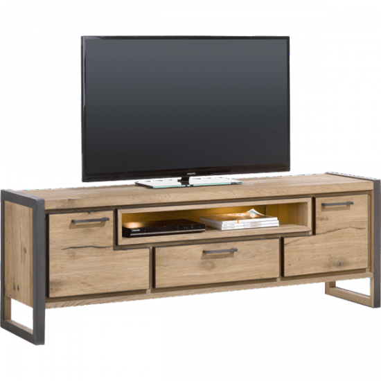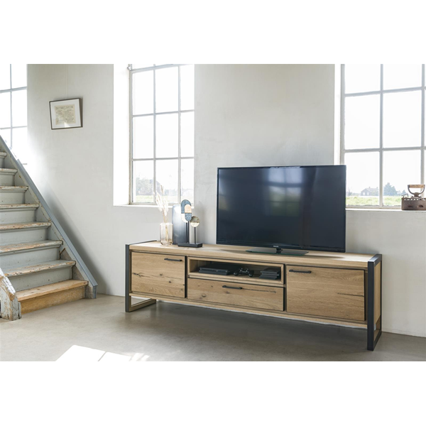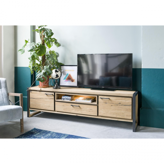 Augstums – 60cmMeklējat stilīgu TV kumodi ar mūsdienīgu izskatu? Farmland kolekcijā ir 180cm gara tv kumode ar divām durvīm, vienu atvilktni un vienu nišu ar LED apgaismojumu. Kumode ir izgatavota no ozolkoka un ozola finiera, un tai ir stilīgas metāla detaļas.