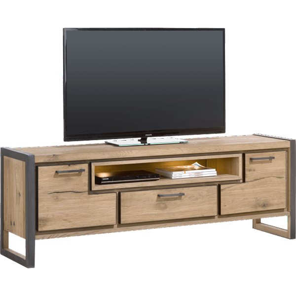 Augstums 60cmShimanto kolekcijā no Henders & Hazel jūs atradīsiet 3 dažādas zemās TV mēbeles. Šī ir vidēja izmēra TV kumode, kuras platums ir 150 cm. Tāpēc tā ir ideāla mēbele mazām vai vidēji lielām dzīvojamām telpām, kas lieliski sader ar citām šīs kolekcijas mēbelēm. Visspilgtākais Shimanto kolekcijā ir smalkie rokturi un kājas ar koka inkrustāciju. Tie piešķir kolekcijai jauku un dabisku izskatu. Atvērts nodalījums ir atstāts arī brīvs jūsu televizora dekoderim, kuru savukārt smalki izgaismo iebūvētais LED apgaismojums. Papildus atvērtajam nodalījumam šai kumodei ir arī atvilktne un divas durvis. Mēbeles izgatavotas no ozolkoka finiera krāsā Bright Oak Natural.