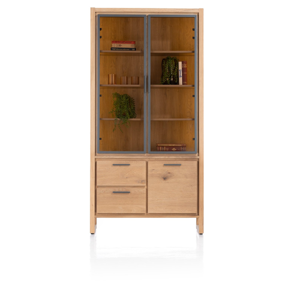 Augstums – 200cmVitrīnai ir divas stikla durvis un trīs atvilktnes, tā ir pilnībā izgatavota no finierēta ozola koka. LED apgaismojums.